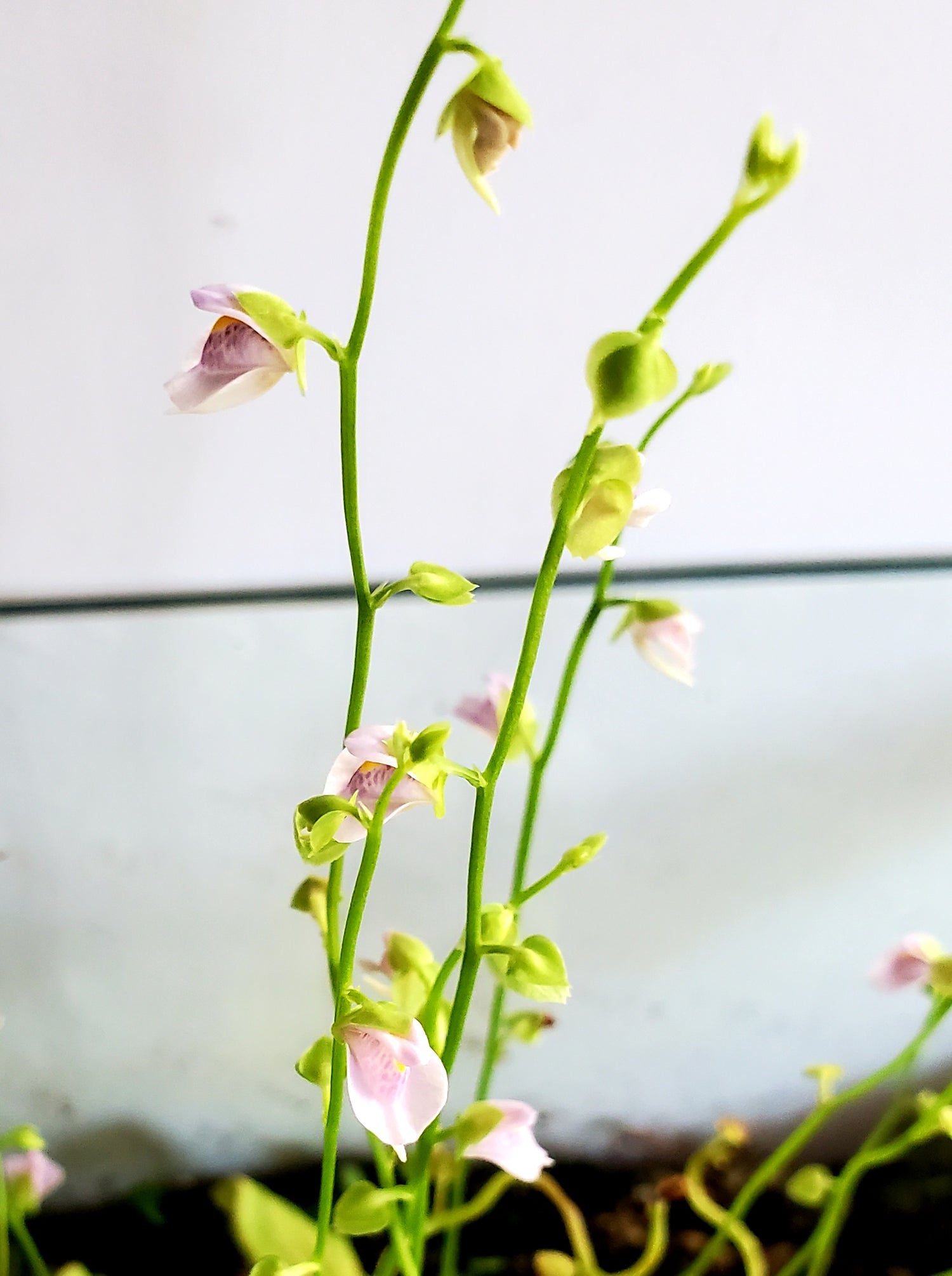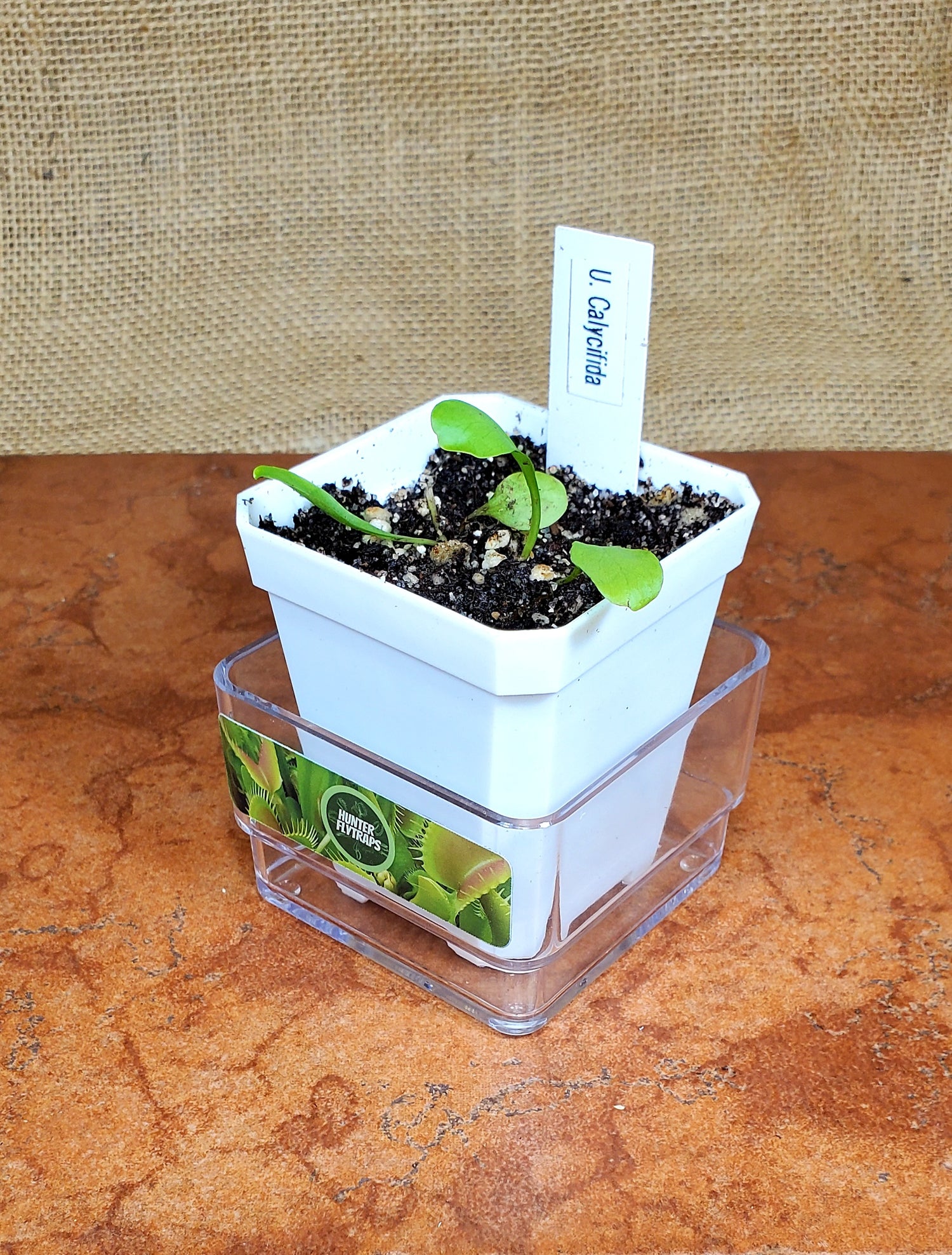 These carnivorous plants use bladders that they grow underneath the soil or water level to eat miniscule insects. Utricularia Calycifida grows somewhat wide and low rounded leaves up to 3 - 4". They also produce beautiful but tiny purple flowers on long firm thin stalks regularly. These plants will grow continuously outward, filling whatever pot you put them in.