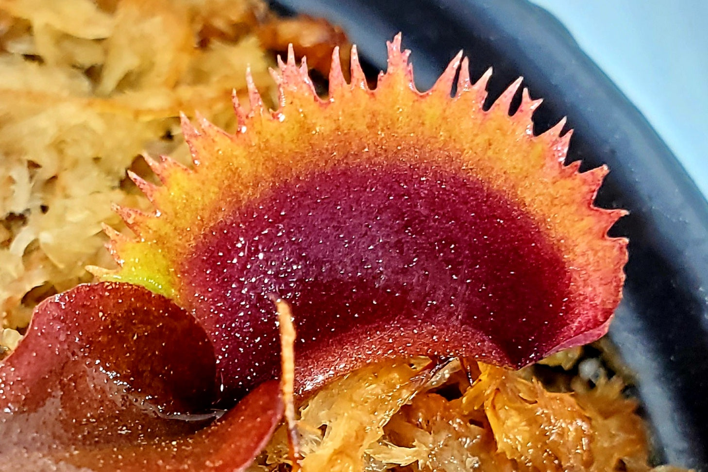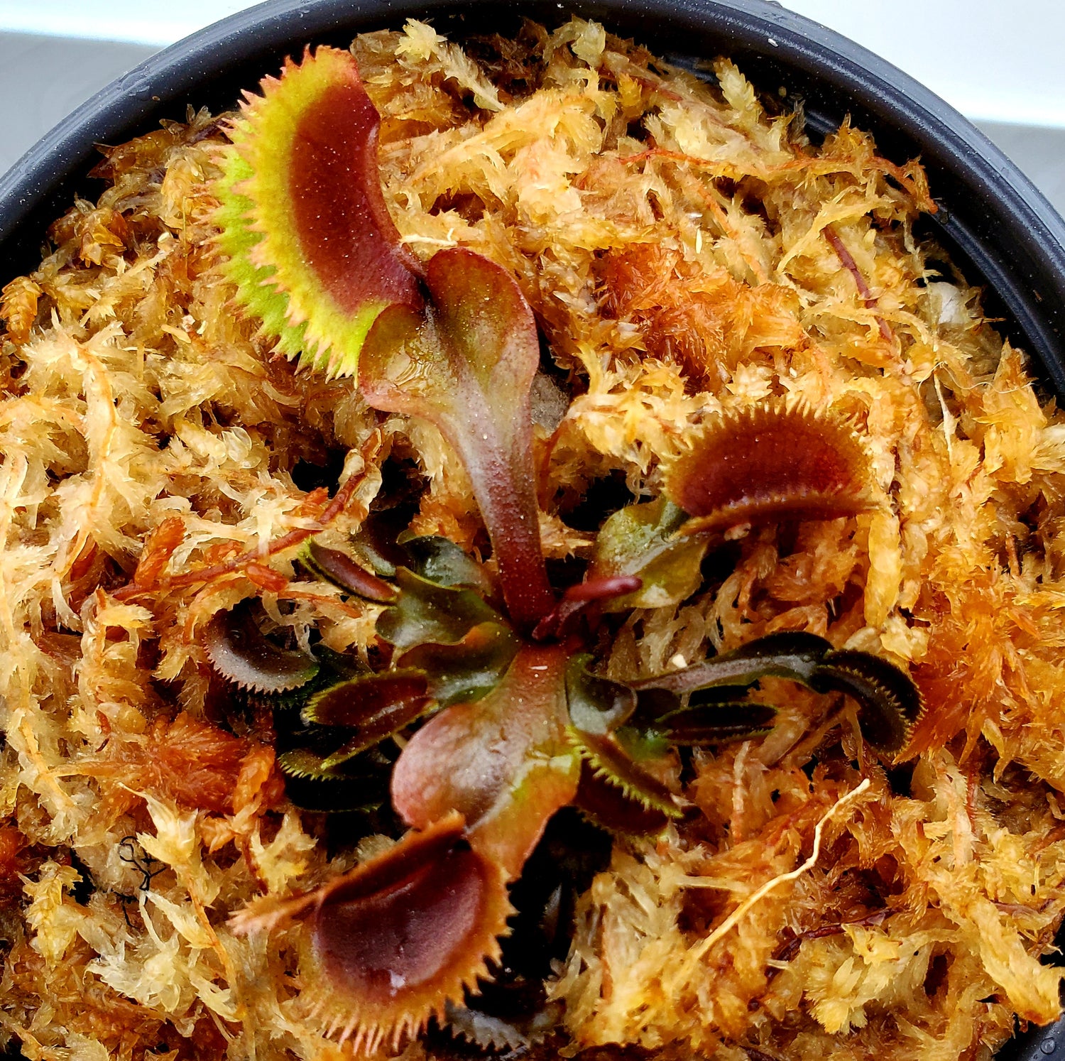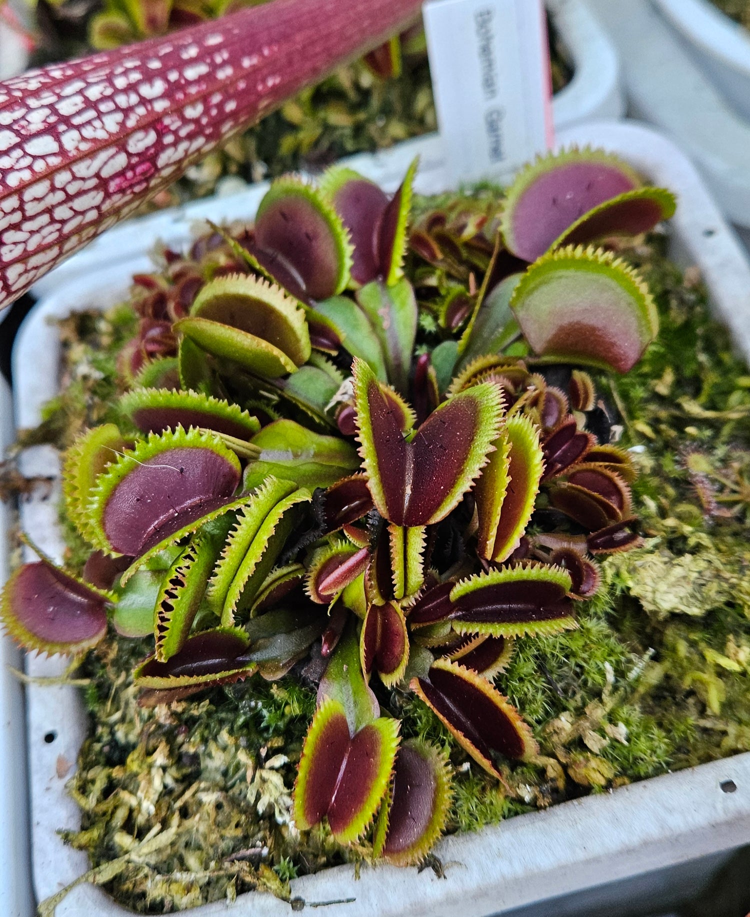 Saw like teeth, and beautiful deep red with bright green/yellow accents. This plant produces many divisions of baby traps. Bohemian Garnet is a registered cultivar.