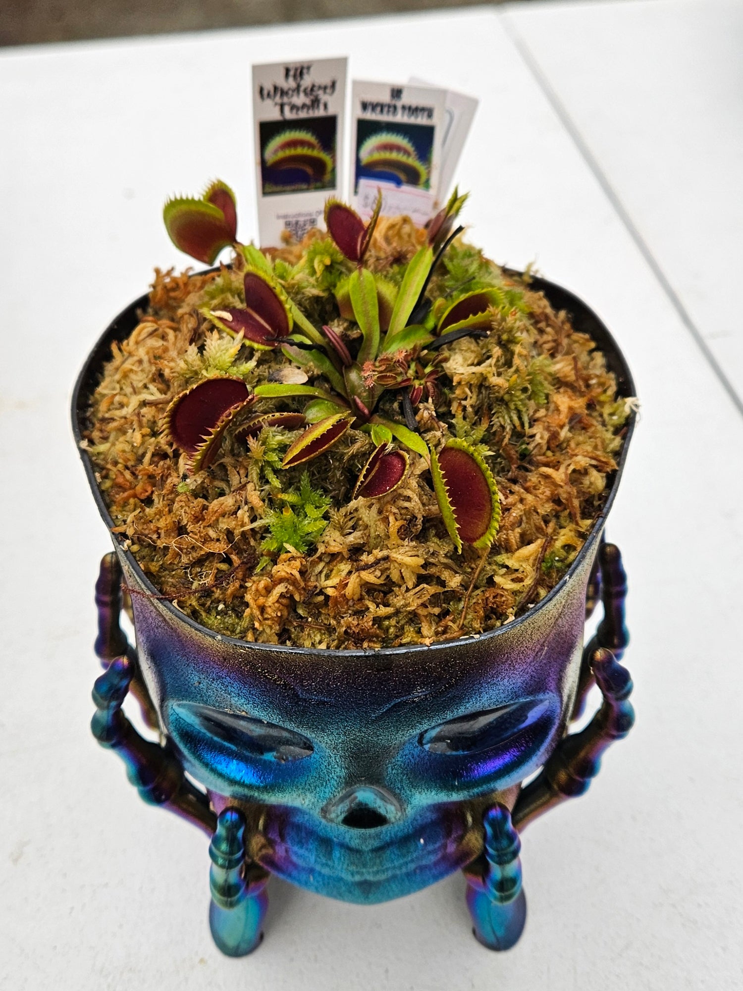 You will receive: This exact 073 - Hunter Flytraps "Wicked Tooth" venus flytrap Skull Pot Carnivorous plant sas shown in photos with live sphagnum moss etc, in skull pot.