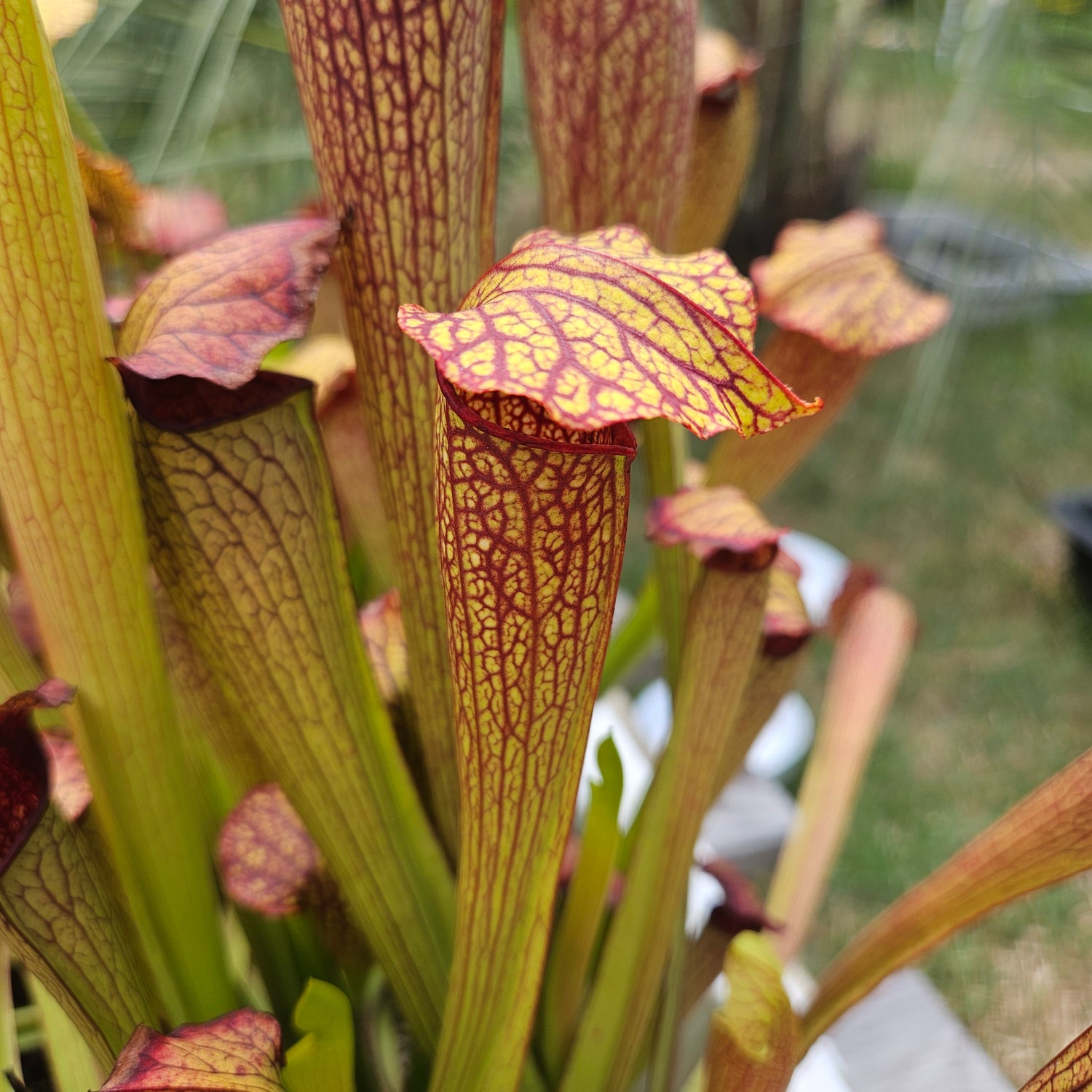 These get close to 2 ft, have capped over hoods that are green with deep red veining, efficient pitchers. Very vigorous and divide plenty. Do not have a proper ID for these plants, but they are an outstanding addition.